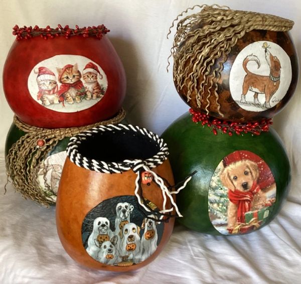 Happy Jacks – This is an easy and fun class that any level gourder can master! We will learn how to place, draw and then cut out your Happy Jack face and leaf embellishments. You will create your Jack, add color then add color to the leaves used for the embellishments. We'll use raffia and coated wire to attach and we'll be using polyurethane spray to seal everything. Instructor will provide cleaned gourds for this class.